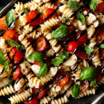 A refreshing dish that combines the classic Italian Caprese salad with hearty pasta, featuring fresh tomatoes, mozzarella, basil, and balsamic glaze.